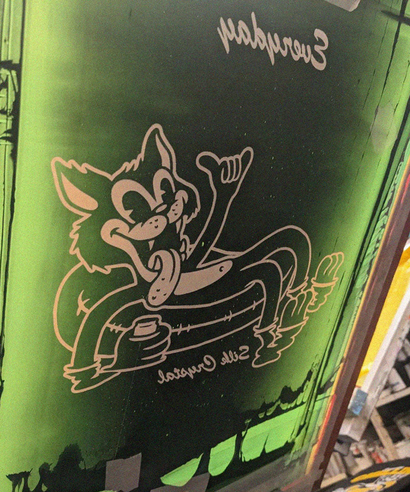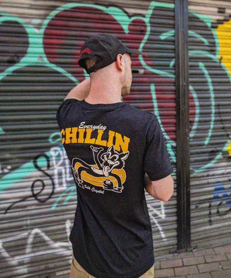 Classic black tee with our chillin' cat screen printed on the back and Silk Crystal logo in the chest.