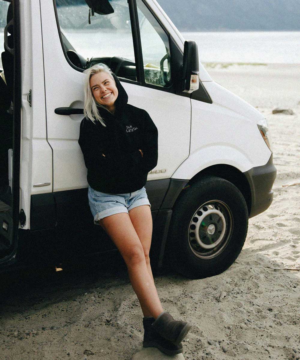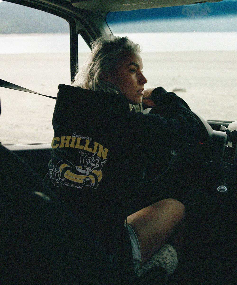 Classic black hoodie with our chillin' cat screen printed on the back and Silk Crystal logo in the chest.